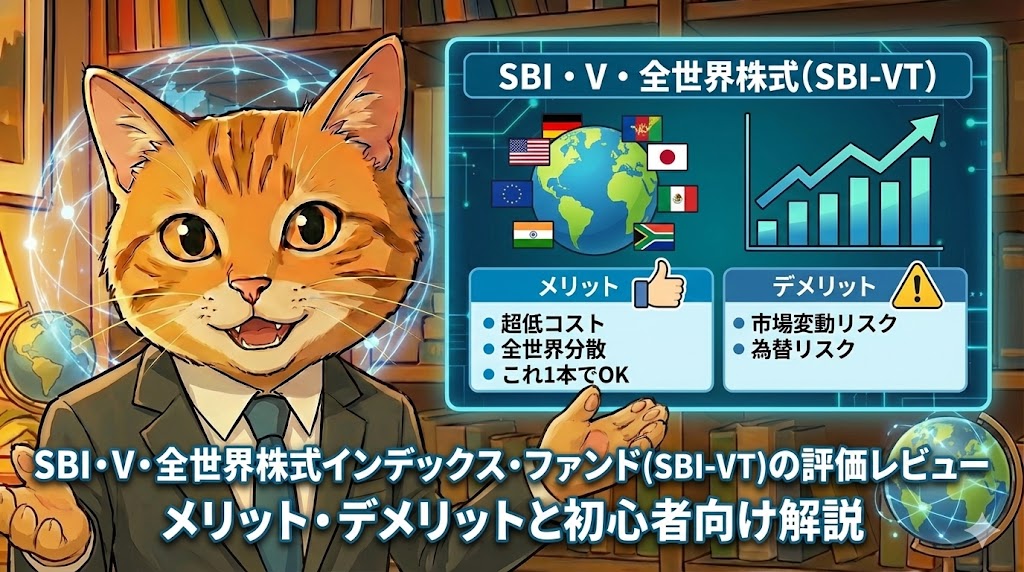 SBI・V・全世界株式インデックス・ファンド(愛称:SBI-VT)は、日本を含む全世界の約9,000銘柄に分散投資できる低コストのインデックスファンドです。バンガード社の「VT(Total World Stock ETF)」を通じて投資するため、信託報酬は年率0.0638%程度と非常に低く、長期の資産形成に適しています。
